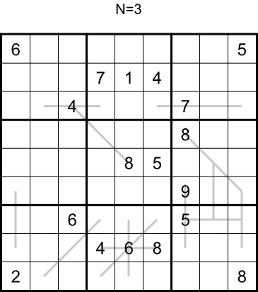 Toutes les suites arithmétiques rectilignes de N chiffres ou plus sont signalées par des lignes. Une suite arithmétique est une série de chiffres, strictement croissante ou décroissante, telle que l'écart entre deux chiffres adjacents est toujours le même (et est différent de 0).